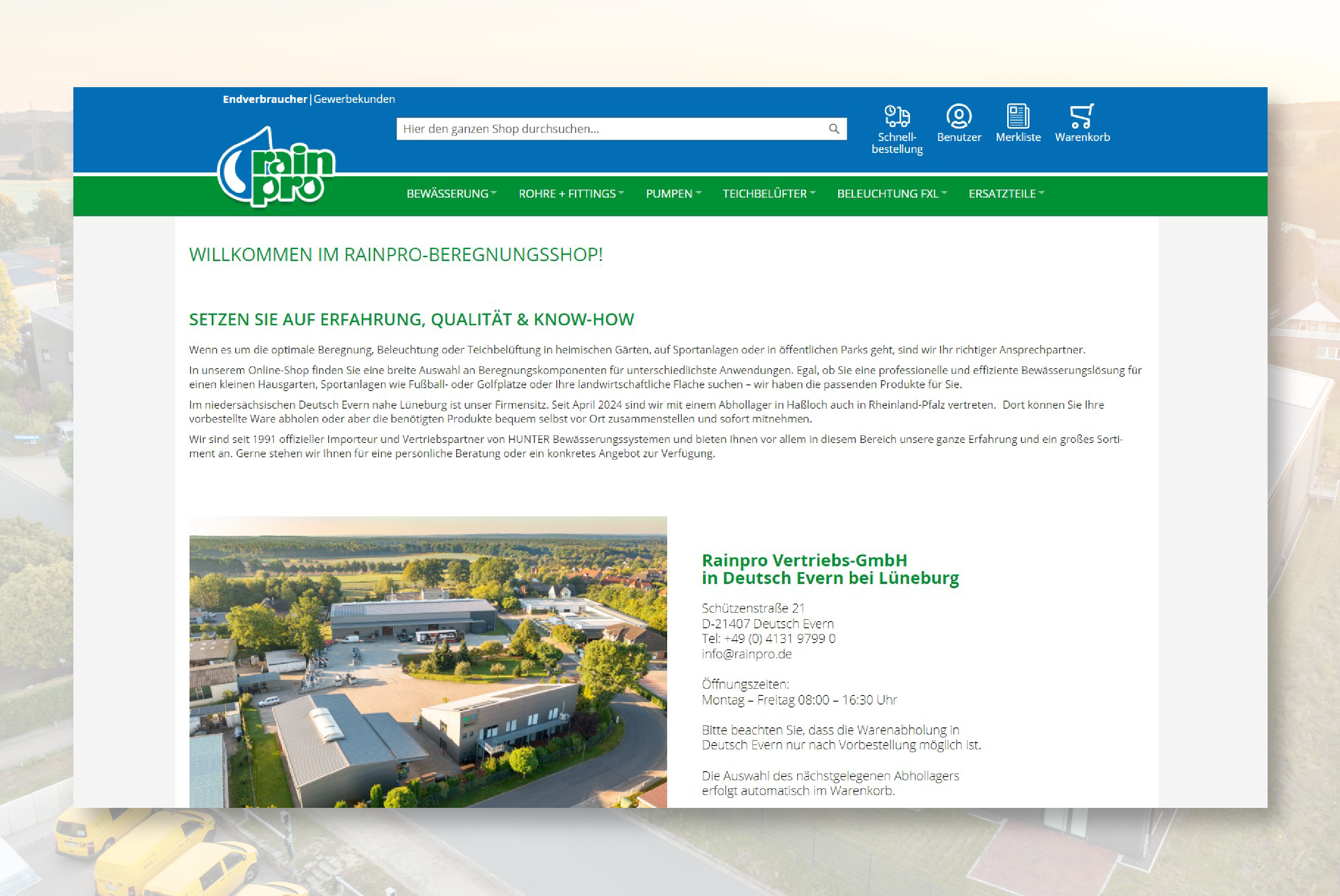 Seit 1928 bieten wir Ihnen gemeinsam mit unserer zweiten Unternehmung "FECO GmbH" Qualität, Erfahrung und Zuverlässigkeit. Im niedersächsischen Deutsch Evern nahe Lüneburg ist unser Firmensitz. Mit einem Abhollager in Haßloch sind wir nun seit April 2024 auch in der Pfalz vertreten. Hier können Sie vorbestellte Ware abholen oder aber Ihre benötigten Produkte bequem selbst auswählen und sofort mitnehmen.
